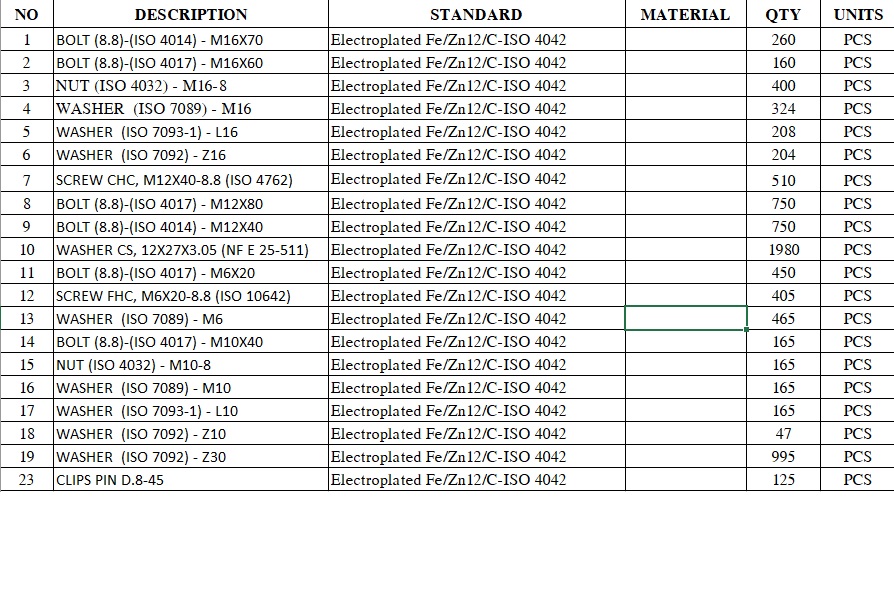 Pro projekt mé společnosti hledám na nákup spojovacích prvků jako typu a množství jako přiložený soubor s povlakem jako ISO 4042 Zinc Electroplated. Přikládám svůj seznam dotazů.