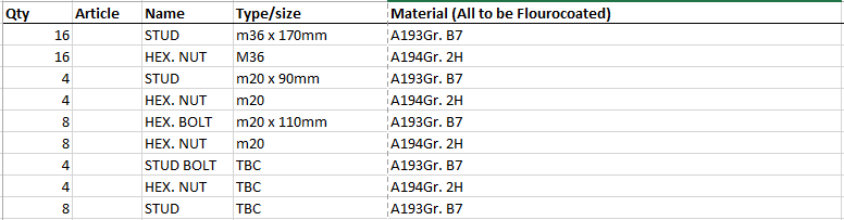 I am contacting you about some fasteners we require to fulfill a customer order. They need to be Fluorocoated. I have attached a brief list of what we require, which will be completed next week.
